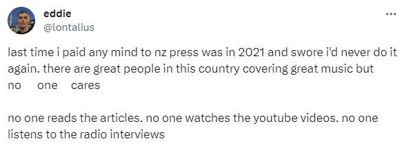 And I'm obviously extremely grateful for anyone who has ever covered or talked about what I do. I know everyone covering music in NZ is working extremely hard and often in their own time.