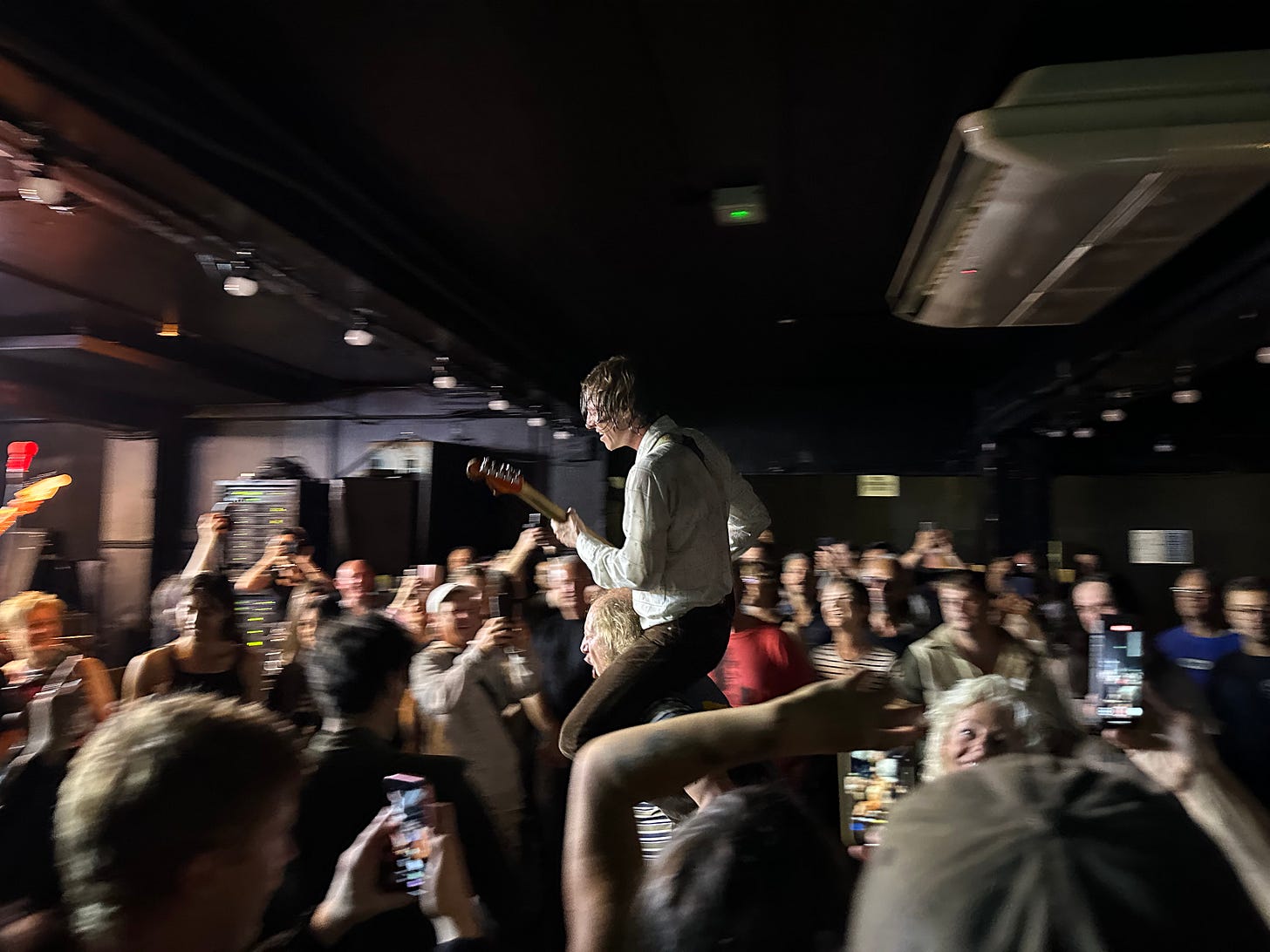 So did the show. So much happened last night I can’t remember it all. At one point, Beers rode the show’s promoter around the stage like a horse. At another, he climbed onto someone’s back and ventured out into the crowd, nearly taking out the heat pump bolted onto Double Whammy’s ceiling. More fans climbed on stage and began playing with the band. It was an absolute riot. Sitting here on Friday morning I’m still grinning about it all.