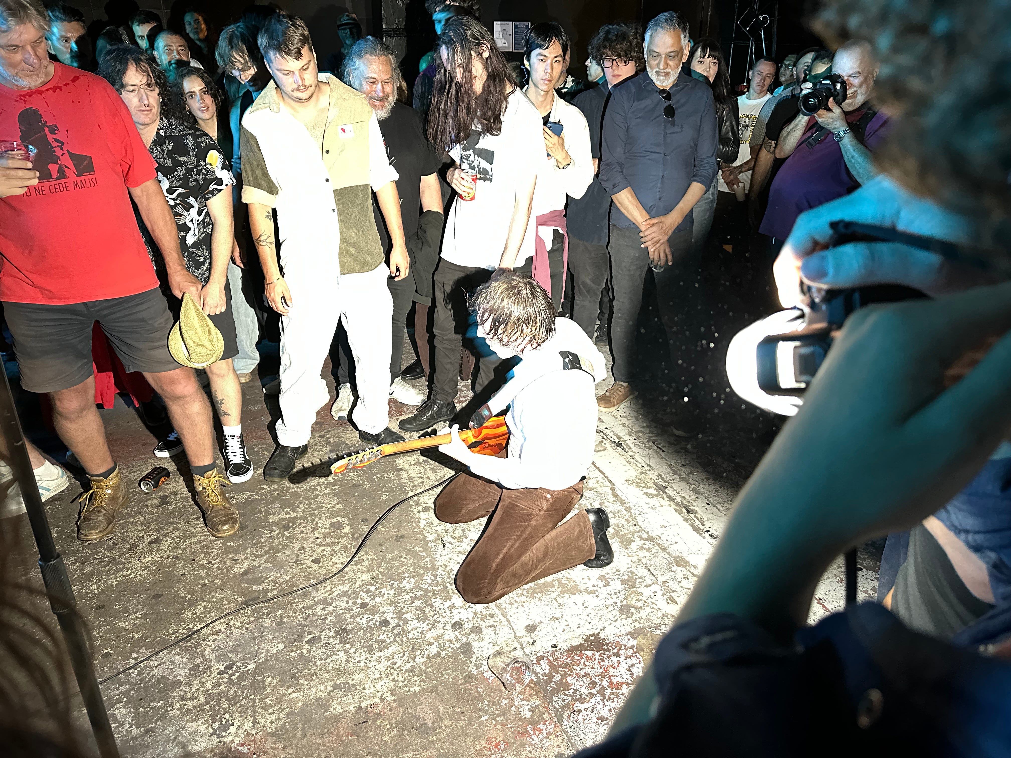 Three songs into the band’s show at Double Whammy last night, the first of a seven-date Aotearoa tour you really do need to see, he began combining all of these moves, swinging his guitar around, twirling across the stage, soloing on his knees, then kicking his mic stand into the crowd and getting fans to help him out with his yelps.