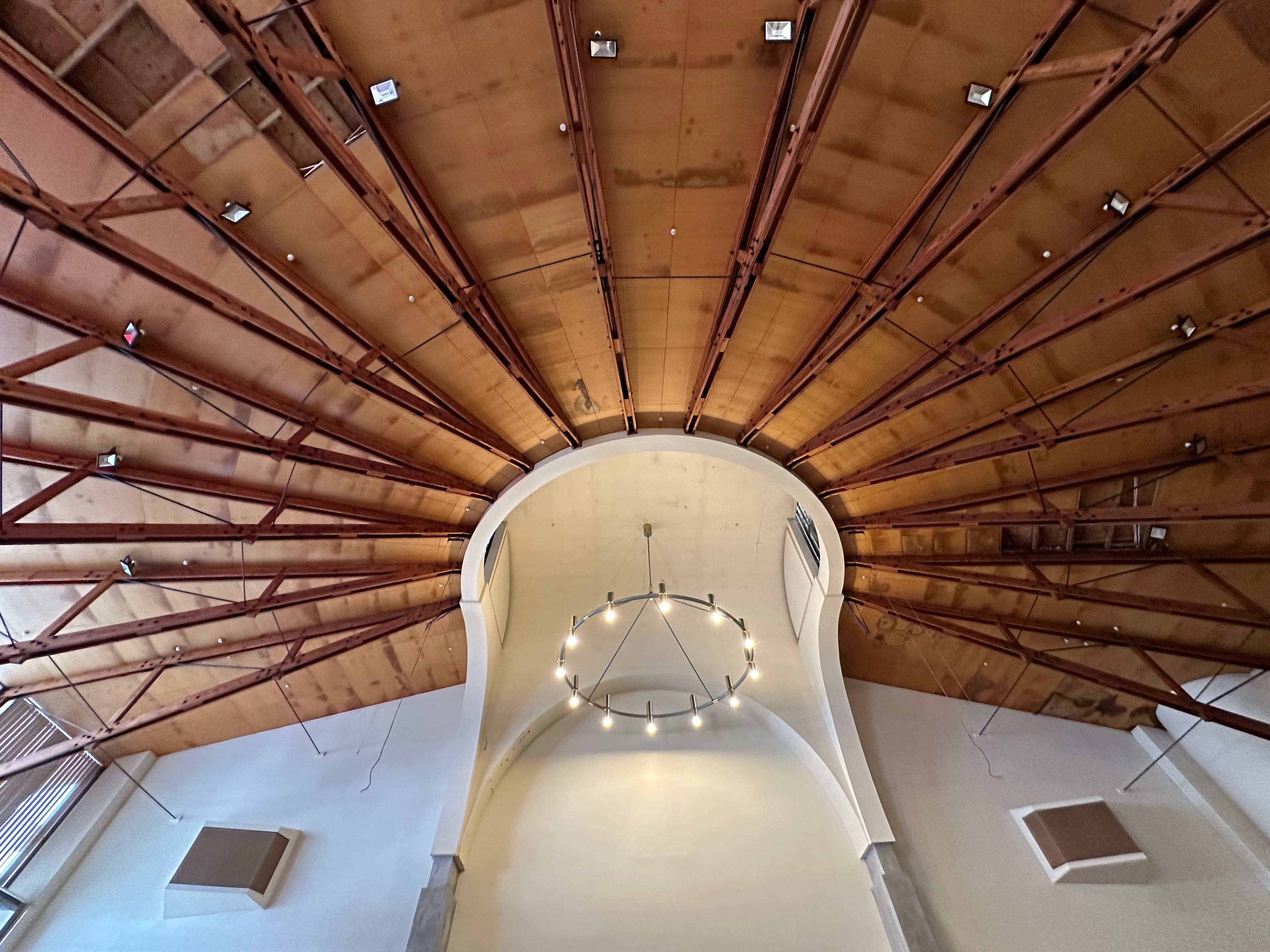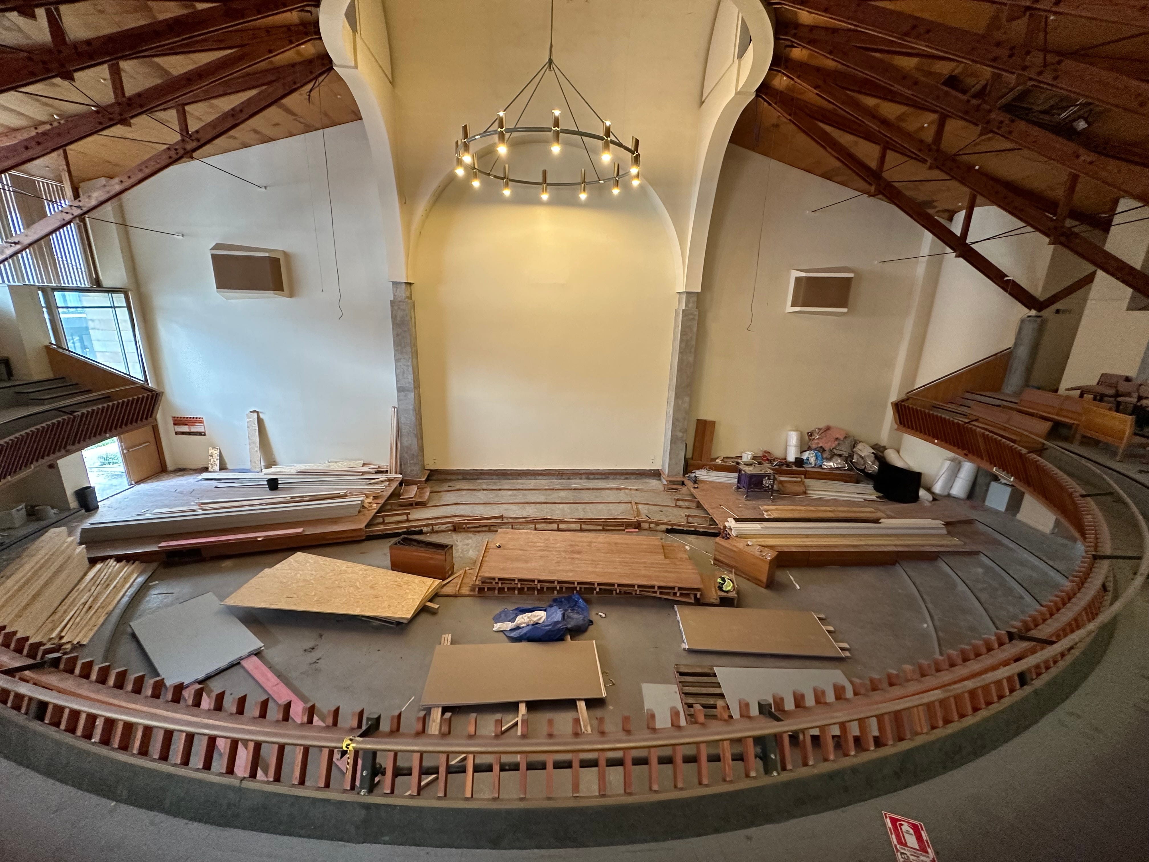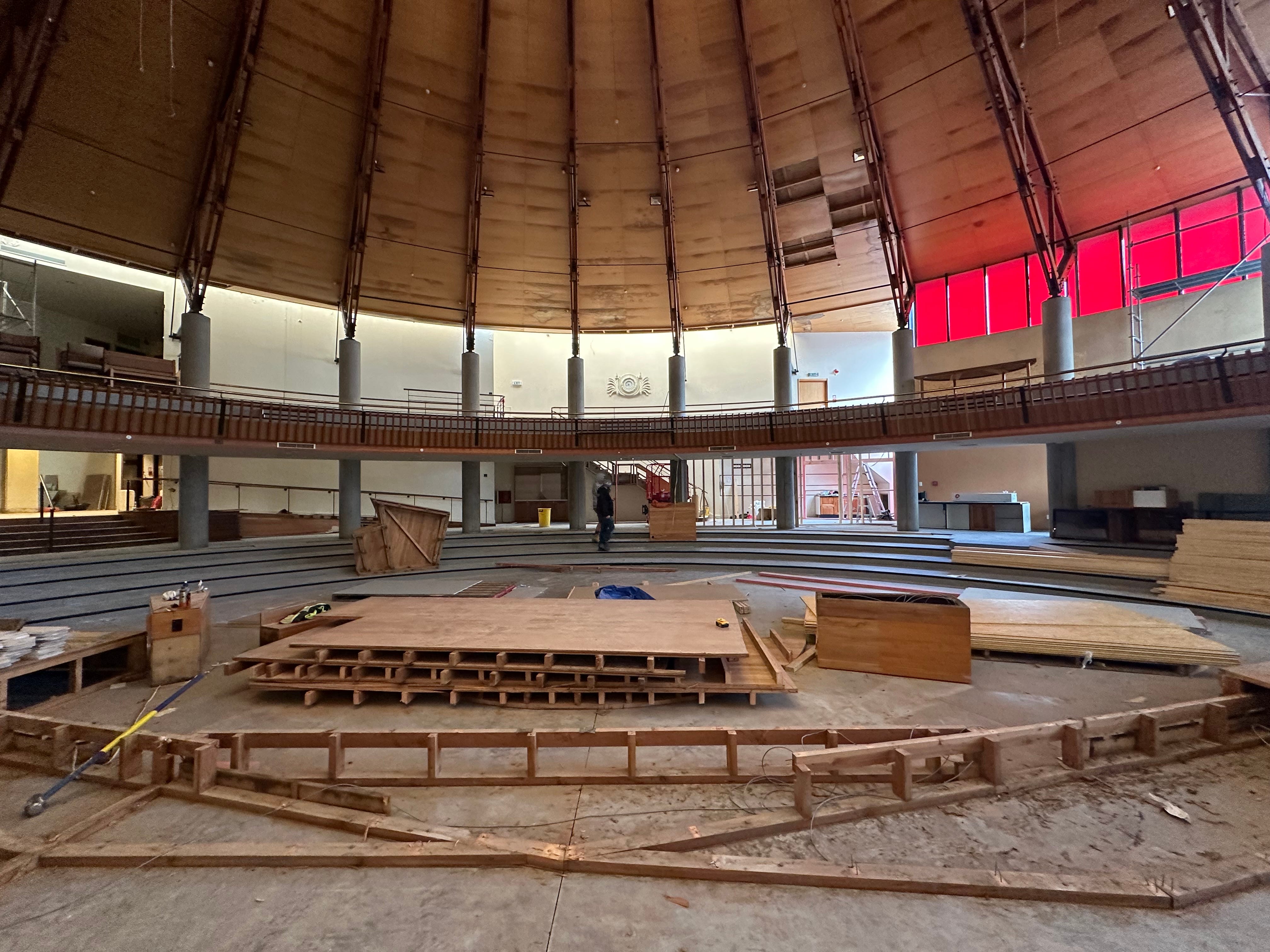Inside, things are even more hectic. The large, airy complex with high ceilings and stained windows is full of noise from hammers, drills and saws. Planks get dropped on the floor. A stereo blasts Outkast’s ‘Hey Ya’. Some sing along. Others occasionally yelp, a sound that echoes off the walls.