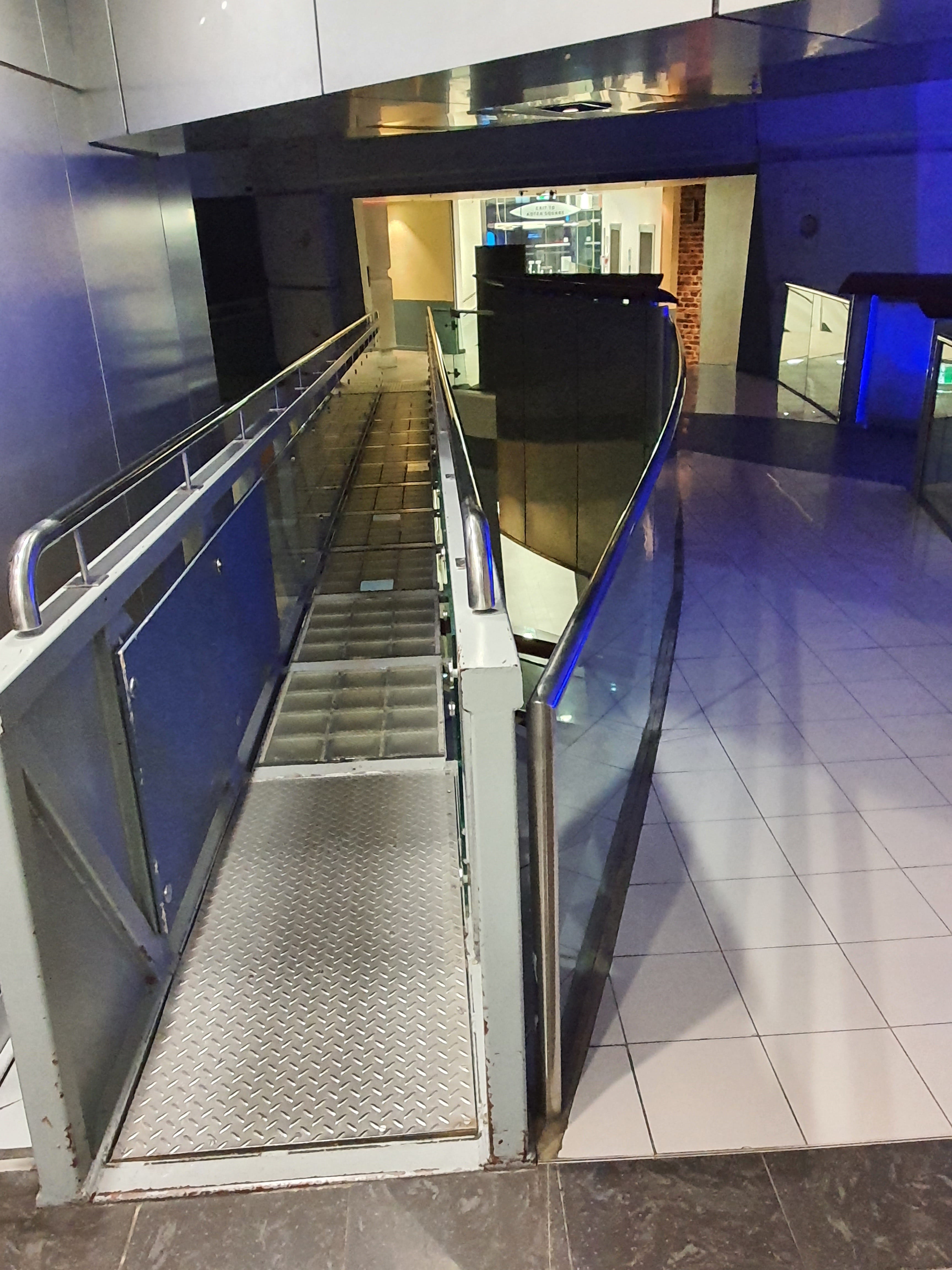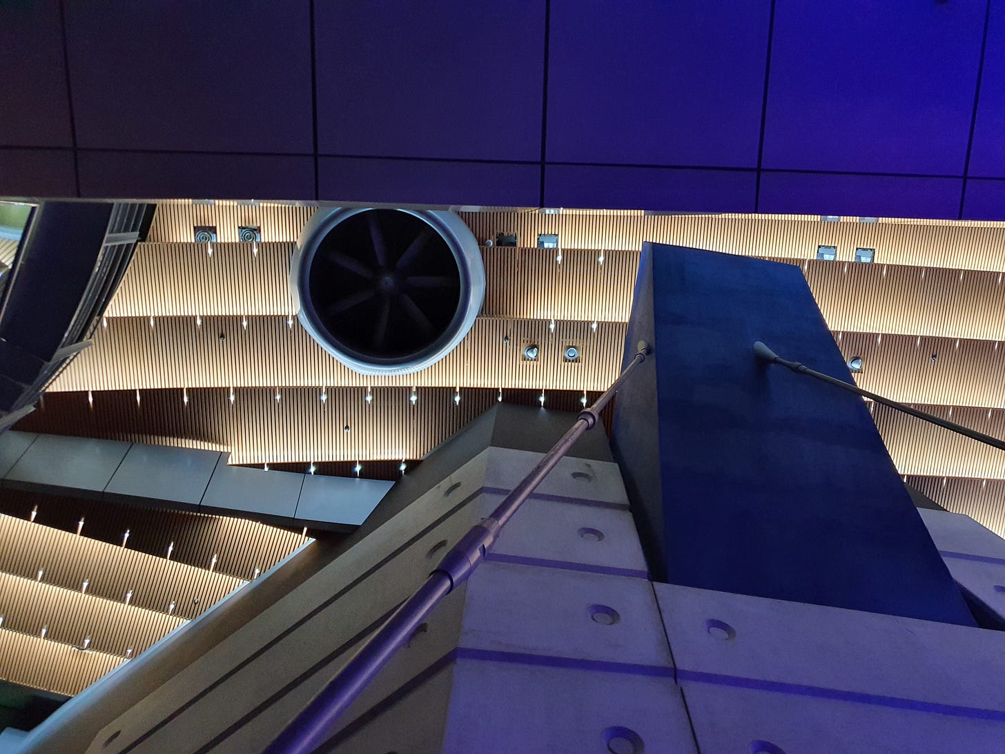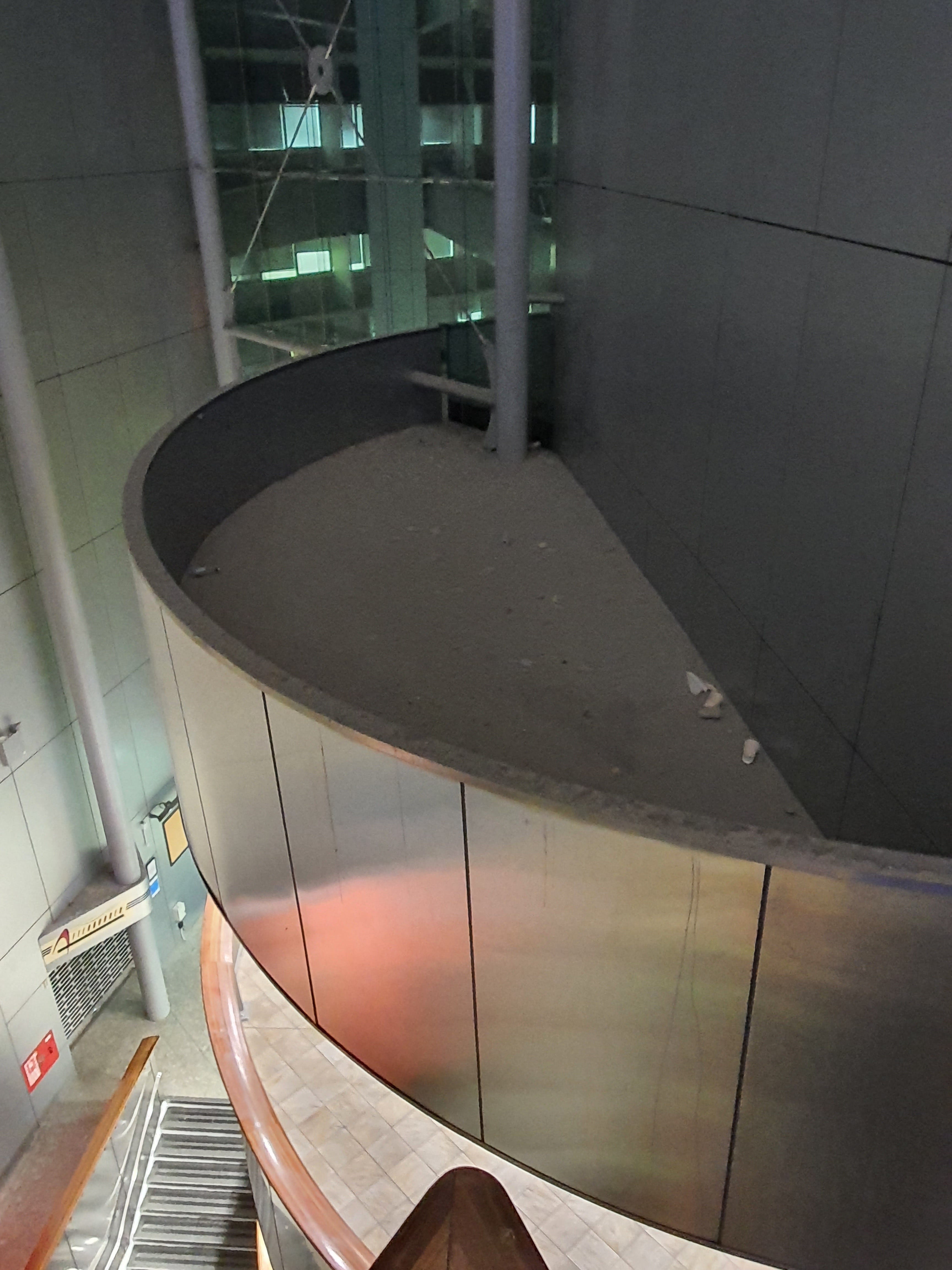 But what’s happening here seems like more than that. The building is so dated, the design so out of step with modern entertainment hubs. I don’t understand any of it: the future-metallic surfaces, the building-within-a-building thing, the permanent scaffolding, the unusable balconies, the bridge to nowhere, the jet engines on the ceiling, the endless spiral staircase that makes me dizzy. None of it makes any sense.