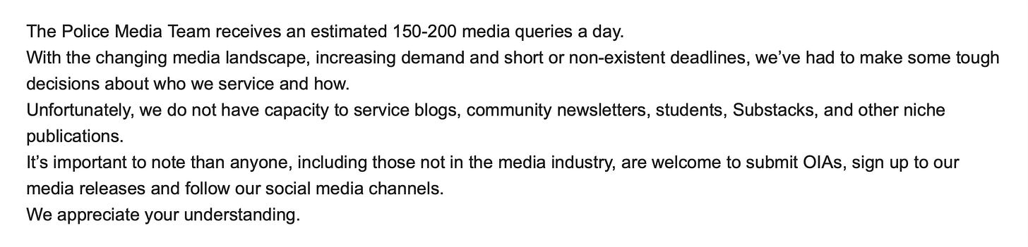 So, instead of sending me a quick statement about why NZ Police sent 18 officers to a chill summer show, I’m now going to take up much more of their time as they collate every internal email, text message, phone call and meeting note for me to scour through to get the answers I’m after.
